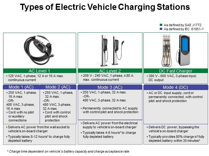 There are AC and DC types of electric vehicle charging stations, both with their own benefits and design challenges. The AC chargers use the vehicle’s onboard charger. The AC Level 1 charging, at 120 V, charges the battery in 8 to 12 hours. The AC Level 2 charging, up to 240 V, cuts charging time in half, and the fast DC charging bypasses the onboard charger; it converts high power AC into DC, charging in less than 30 minutes.