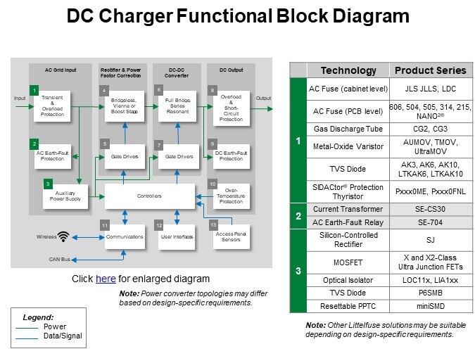 For DC charging stations, DigiKey offers Littelfuse components similar to those used in AC chargers. At the power input stage, the big difference is the need for earth-fault protection. Earth-fault relays are used for equipment and personnel protection in the event of earth/ground faults.