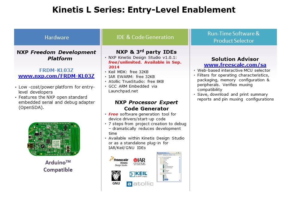 The NXP Freedom development platform is a set of software and hardware tools for evaluation and development. It is ideal for rapid prototyping of microcontroller-based applications. The NXP Freedom KL03Z hardware, FRDM-KL03Z, is a simple, yet sophisticated design featuring a Kinetis L series MCU, built on the ARM® Cortex®-M0+ core. Processor Expert is a simplified code initialization tool designed to provide 80% of the required firmware from NXP, allowing designers to focus on the 20% of their own internal code that truly differentiates their products. Solutions Advisor is a web based tool, available on the NXP website, that allows designers the ability to identify the ideal Kinestis solution, be defining the operating characteristics of the device they need, memory configuration, analog, communications and clock peripherals. In addition, it directs them to the associated hardware and software tools and documentation and verifies pin muxing compatibility.
