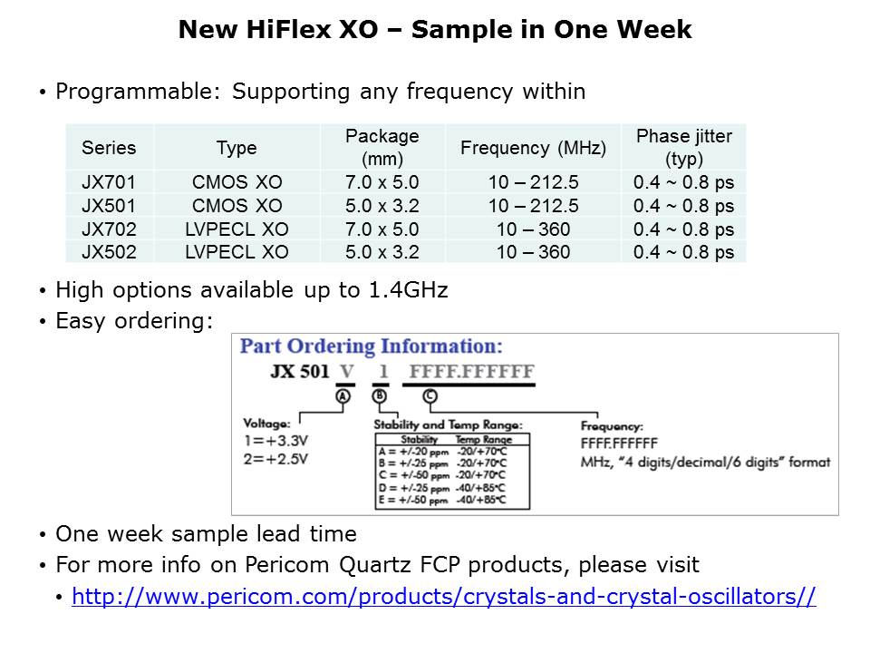 In order to satisfy the customer’s requirements for quick turn time, Pericom also has a line of programmable crystal oscillators. The JX (HiFlex) line provides customers with a programmable crystal oscillator that can be customized per the request and shipped within a week to help meet those tight design deadlines.