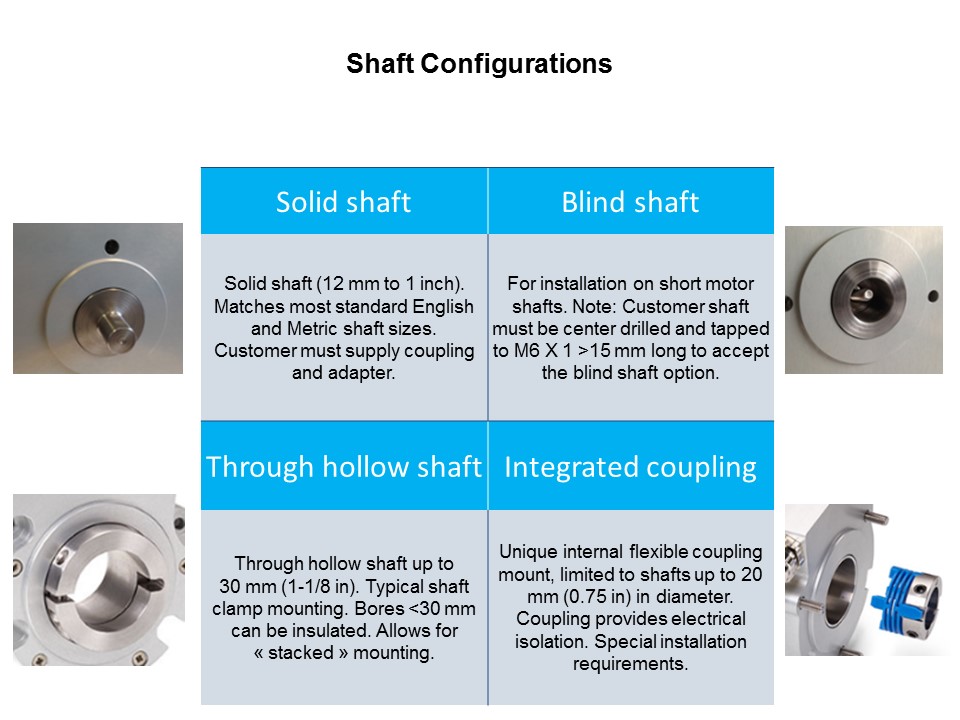 The LP35 comes in one of four mounting methods shown here. The two on the left, shafted and hollow-shaft, are fairly common and are widely used in most encoder applications. The blind shaft mounting is for instances where the mating shaft does not need to continue through the encoder to mount additional hardware, like a fan. The integrated coupling is more complex to install correctly; however, it maintains the low profile. Since it is flush mounted with the encoder body, it does not add to the overall thickness.