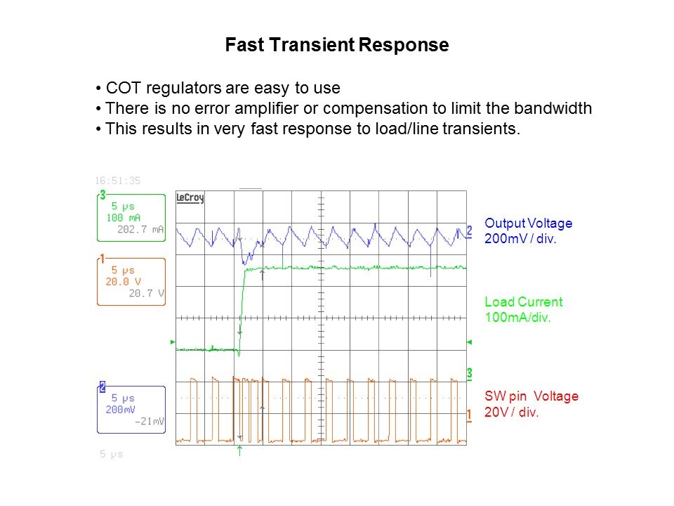 Another advantage of the constant on-time is the lightning-fast transient response because there is no error amplifier and an almost immediate response of the comparator. Furthermore, because there is no error amplifier there is no loop compensation required either, which is normally a headache to design for switching buck regulators. Also, because the constant on-time is fundamentally a comparator and a one-shot timer it is inherently simple to design with.