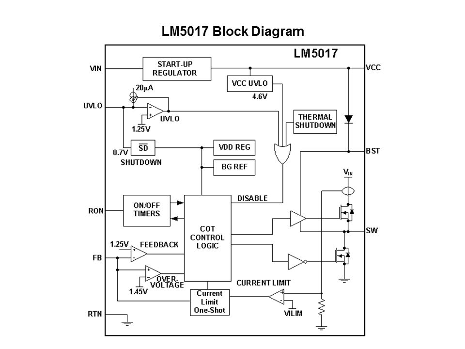 For a number of years, TI has developed constant on-time (COT) high-voltage devices, and they have always required an external catch diode. With LM5017, TI now has a more integrated solution that is fully synchronous, more efficient, smaller, and more user-friendly for the customers. Shown on this slide is the block diagram of the LM5017. As can be seen, there are the two switches (FETs) near the lower right corner, and a high-voltage, 100 V startup regulator that biases all internal circuitry. Also, there is a precision under-voltage lockout comparator, which is necessary for the isolated applications and also for buck applications when it is necessary to stop operation below a certain level. The RON pin is used to set the frequency, and the feedback circuit is a basic comparator. The boost (BST) is provided for powering the high side gate driver.